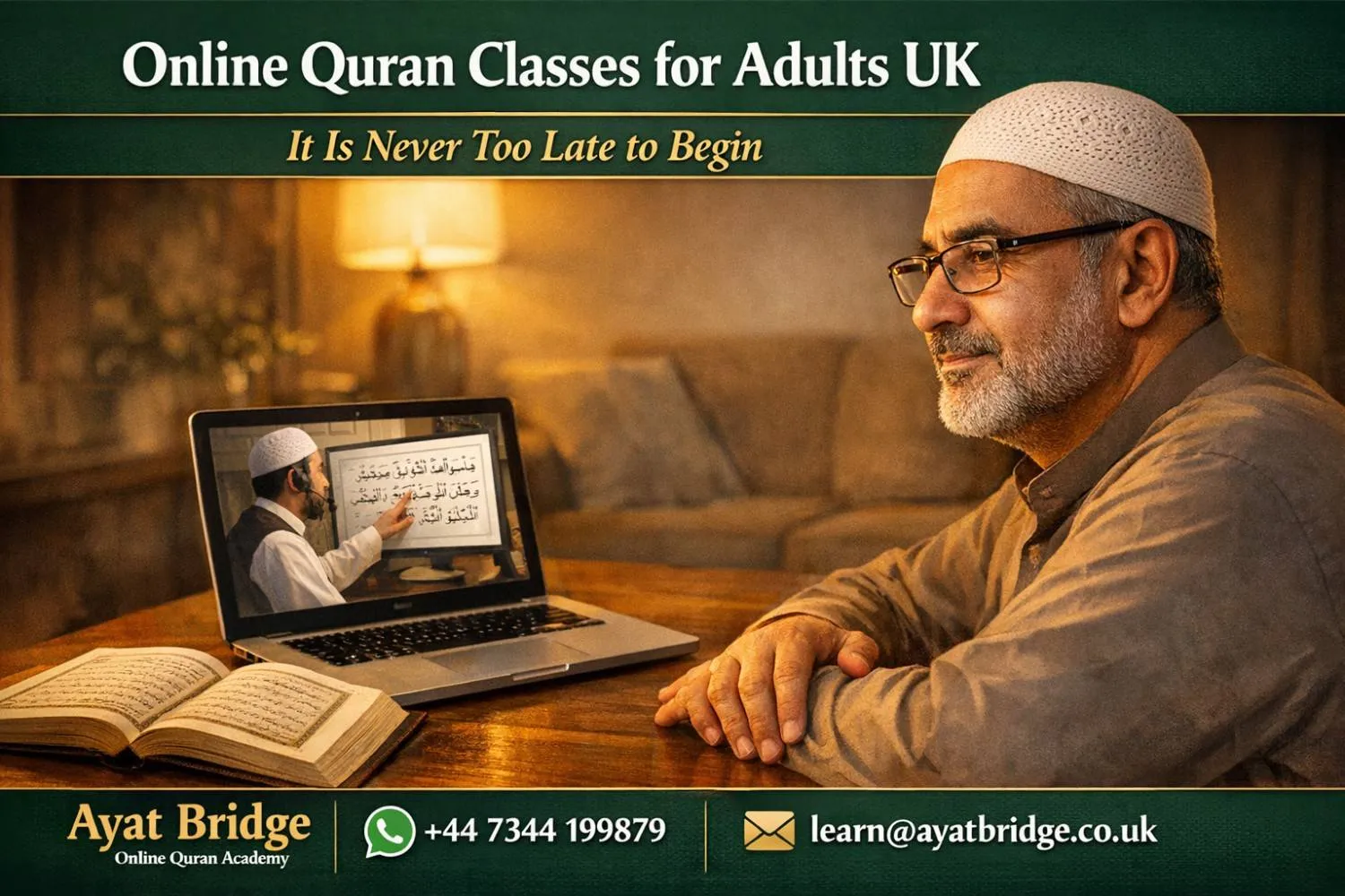 From complete beginners at 40 to adults refining Tajweed at 60 — online Quran classes for adults in the UK have made the Quran accessible to everyone. Here is every course available, how sessions work, what they cost, and why your first class at Ayat Bridge is free.